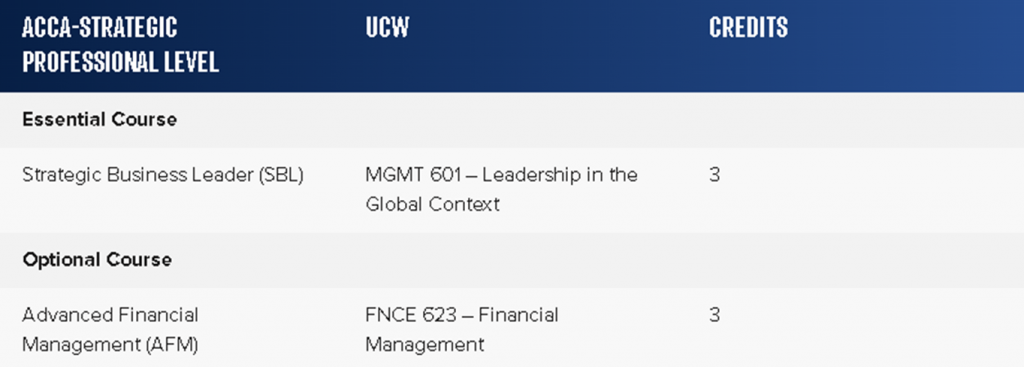 MBA students who pass these ACCA exams will not be required to complete the UCW internal assessment. If students are unsuccessful in their ACCA exams or no longer want to continue their ACCA qualification, they will have the option to continue their MBA by taking UCW internal assessments.